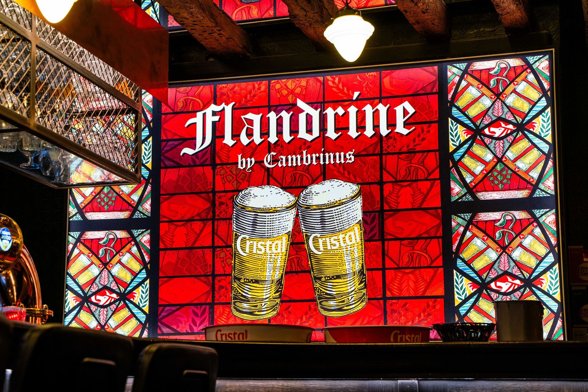 Het interieur werd volledig gestript en heropgebouwd met respect voor het verleden én oog voor sfeer. De warme, dieprode tinten verwijzen naar het Brugse stadsbeeld. De originele toog is vervangen door een stijlvolle, nieuwe bar met maar liefst twaalf tapkranen. Blikvanger is het melkglasraam met Koning Cambrinus, een knipoog naar de legende en de liefde voor bier.